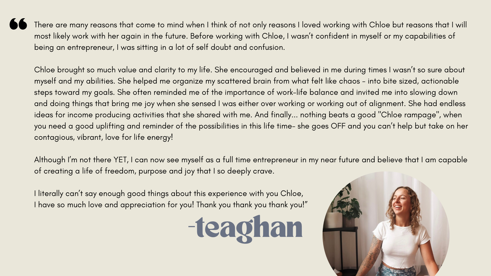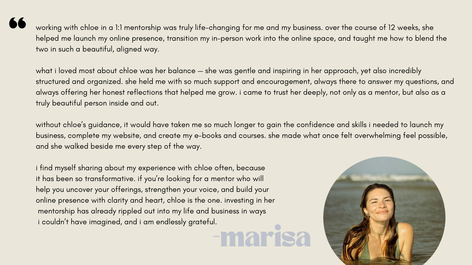 Over the last two years (starting Feb 2023), I decided to start facilitating private 1:1 mentorship experiences for anyone who feels called to learn from me, my experiences, my knowledge, and gain access to my energy & resources in the self development and entrepreneurial space. At first I started this simply as an experiment to see whether or not it was something I was capable of not only succeeding in, but really enjoying. I started by mentoring one individual client at the start of 2023 and fell absolutely in love with the process of intimately getting to know someone through their personal & business struggles, and then helping them craft a way out of them. Being able to personally witness the results of their labor and mine - was infinitely rewarding and something I have discovered I absolutely love doing. So now hosting a private 1:1 mentorship experience is something I prioritize into my schedule once every two months! This is really something that I am so proud to be doing and since then, I’ve now personally mentored 13 different women, and each one has been a tremendous success!